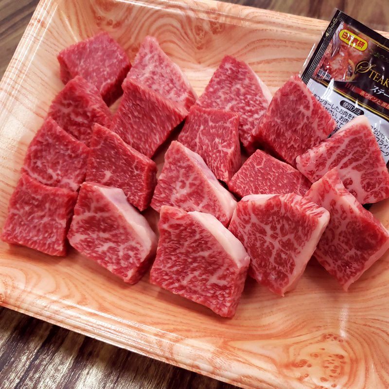 赤身肩肉サイコロステーキは、霜降りが多く、大きなカットでも柔らかく、肉本来の味が楽しめます。