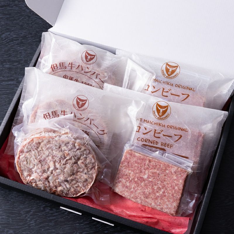 但馬牛100%のハンバーグとコンビーフのお得な詰め合わせ。ぜひ、大切な方への贈り物や日々頑張っている自分のご褒美に!!