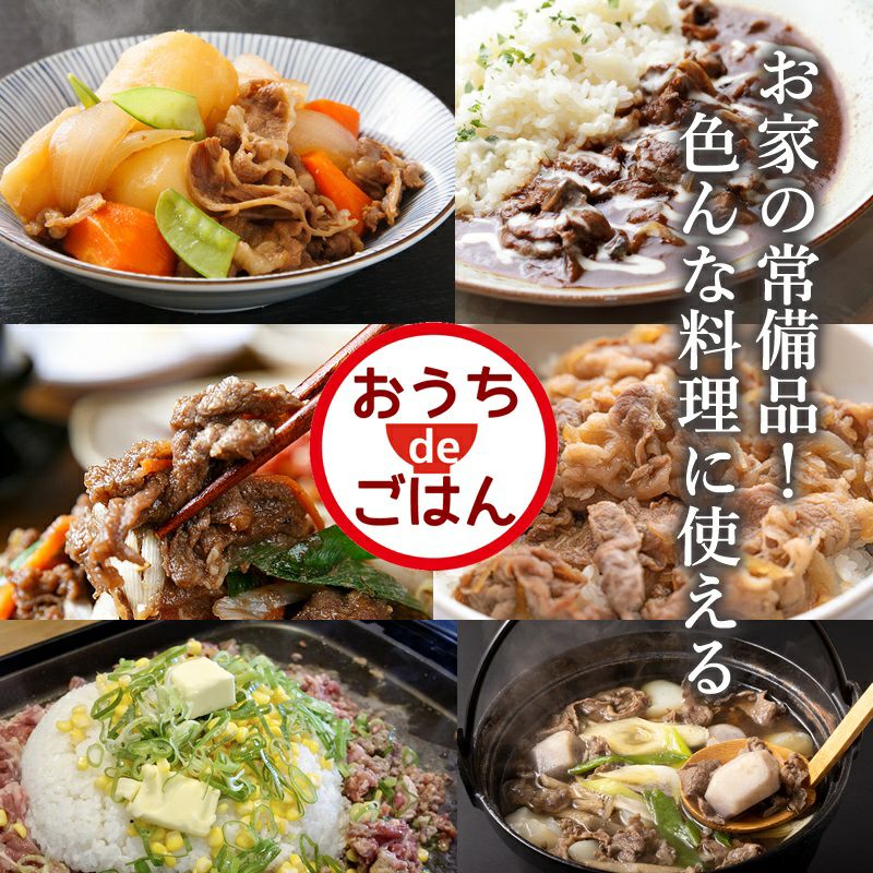 こま切れですが、すき焼きや牛丼風にしたり、色々使えますね。そのまま焼いても焼肉でもいいかも。こま切れなので切る手間も必要なく使いやすいです。